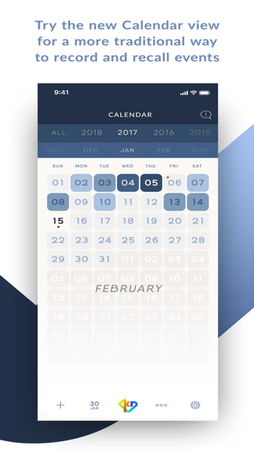 The calendar functionality, new to 2.0, provides a new view for your memories, with graduating colours for dates with more events - so you can see your most eventful days at a glance.