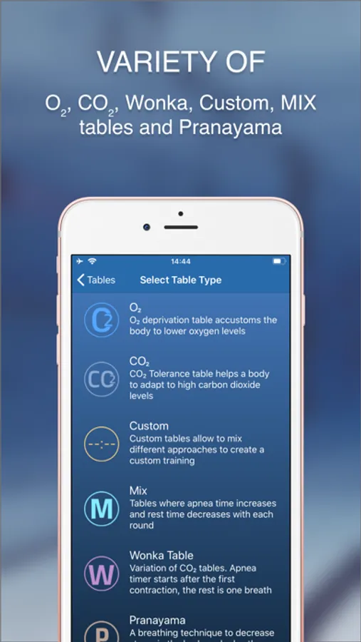 - O2 deprivation table – accustoms a body to lower oxygen levels. This is achieved by increasing the amount of time that you hold your breath on each attempt, while the resting time is fixed.