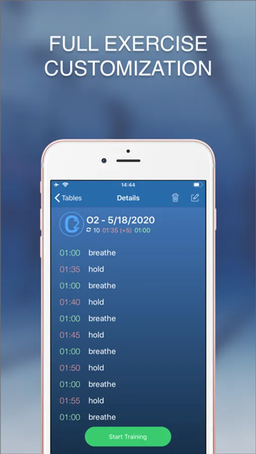 Each exercise can be edited by setting your own number of repetitions, breath hold time, rest time, etc.