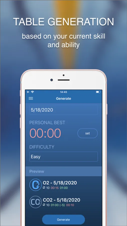 STAmina Apnea Trainer can create / generate custom apnea (exercises that are automatically created based on the maximum breath-hold and match the user’s level) or let you select from the following customizable table types: