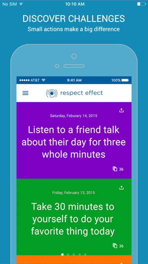 Respect Effect aims to help young people practice healthy relationship skills by completing daily challenges with their significant other (S.O.), friend or family. Users can share completed challenges on the Community Feed, earn points to get placed on the Leaderboard, and view other's challenges. Together, we can create more respectful relationships and digital communities where our collective actions make a big difference and inspires a respect effect!