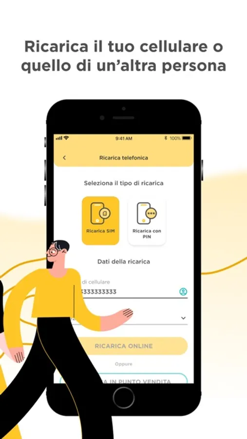 Ricarica il tuo cellulare online direttamente da app o genera il QR Code da mostrare all’esercente per concludere la ricarica in punto vendita.