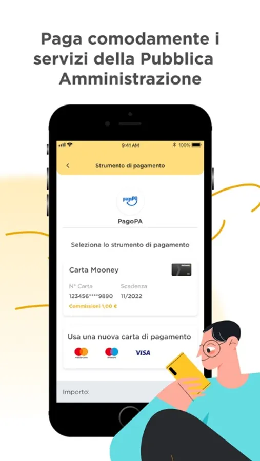 Con l'app Mooney puoi pagare bollette, multe e bollettini, il bollo auto e moto, ricaricare il tuo cellulare o quello di altre persone. Puoi pagare comodamente i servizi della Pubblica Amministrazione con pagoPa, cercare i nostri punti vendita più vicini a te, digitalizzare le ricevute dei pagamenti effettuati in punto vendita e acquistare la carta Mooney, la prepagata Visa per tutte le tue esigenze.