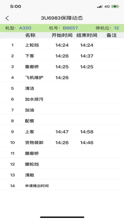 显示包括靠桥、开舱、下客、清洁、加油、登机等所有保障流程的完成情况和备注信息。