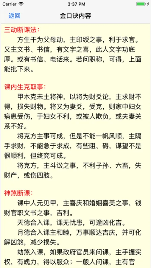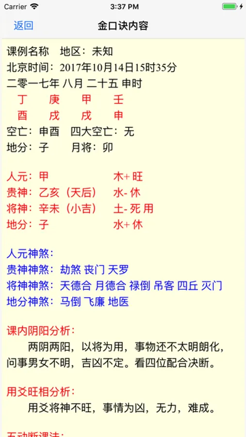 本程序可根据选定的年月日时和您确定的地分,排出六壬金口诀课来,并列出干神将方的阴阳、五行、旺衰、神煞等,找出课内用神,有五动、三动断课,干神将方的生克取事,神煞主事,分类断课(求财、问官、问婚姻、问病、问射覆、问失窃、问官司、问家事、问交易、问拜访、问合作等二十多类),定应期等内容。