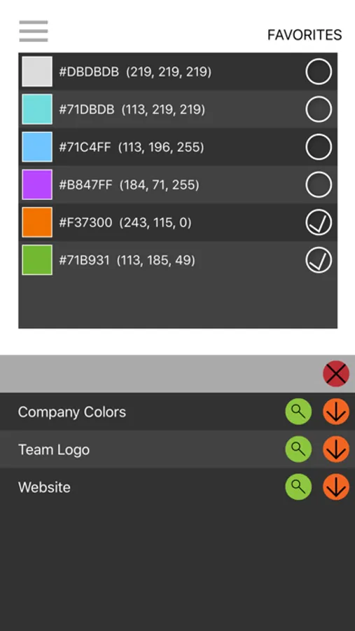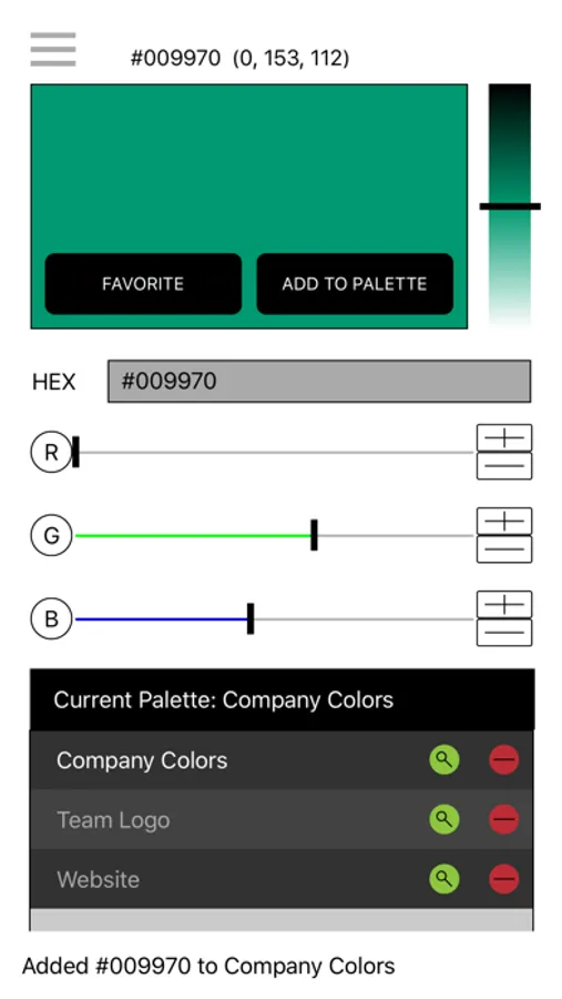 Intuitively customize your own palettes using standard rgb sliders. The palette editor supports the addition and removal of individual colors, and the display of rgb and hexadecimal color information in a streamlined fashion. In addition you can save your favorite colors in a queue, and quickly retrieve and load them by simply tapping them.
