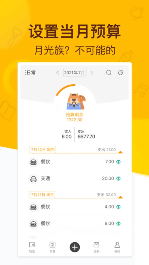 ·制约剁手:设置当月预算,月光不再怕,小松鼠随时提醒剩余花销。