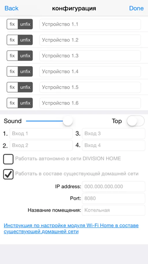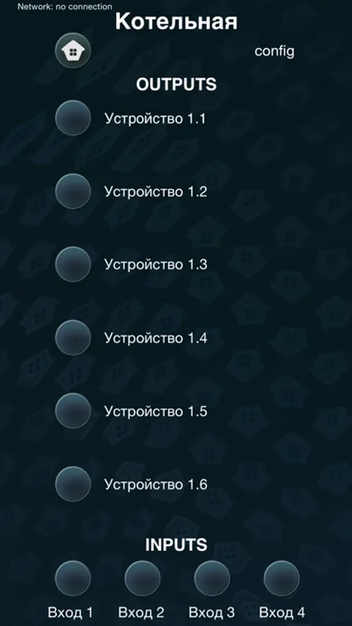 Чтобы приступить к управлению модуля Wi-Fi home необходимо указать в приложении его IP адрес и порт (по умолчанию 8080). Для этого используйте раздел config. Убедитесь, что галочка стоит на графе "Работать в составе существующей домашней сети", в поле IP адрес впишите IP адрес и порт, заданный модулю Wi-Fi home в результате настройки (по инструкции). Нажмите кнопку Done. Если настройка прошла успешно, но на странице управления входами/выходами модуля Wi-Fi home индикатор состояния сети будет зелёным, рядом будет указано название сети. В противном случае индикатор будет красным, "Network: no connection".