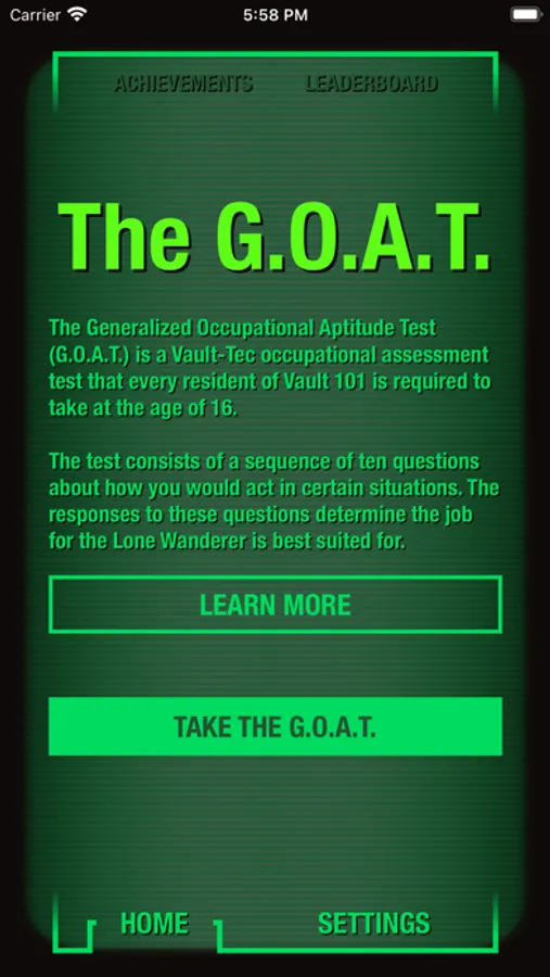 The Generalised Occupational Aptitude Test (G.O.A.T.) is a Vault-Tec occupational assessment test that every resident inside Vault 101 is required to take at the age of 16 to determine their future job.