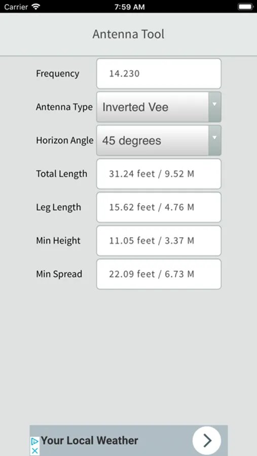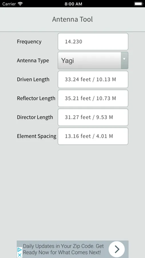 A tool to help ham radio, CB, and other radio users to create antennas of various types. Calculations available for dipole, vertical (1/8, 1/4, 3/8, 1/2, 5/8, 3/4, 7/8, and full wave), inverted vee, quad loop, delta loop, and yagi. Simply enter the frequency, select the antenna type, and all necessary calculations are displayed.
