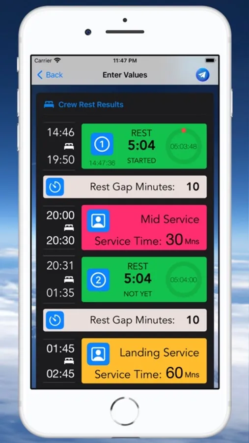 - Detailed results view including gap indicators, end of rest periods, start of landing or mid service, estimated landing time.