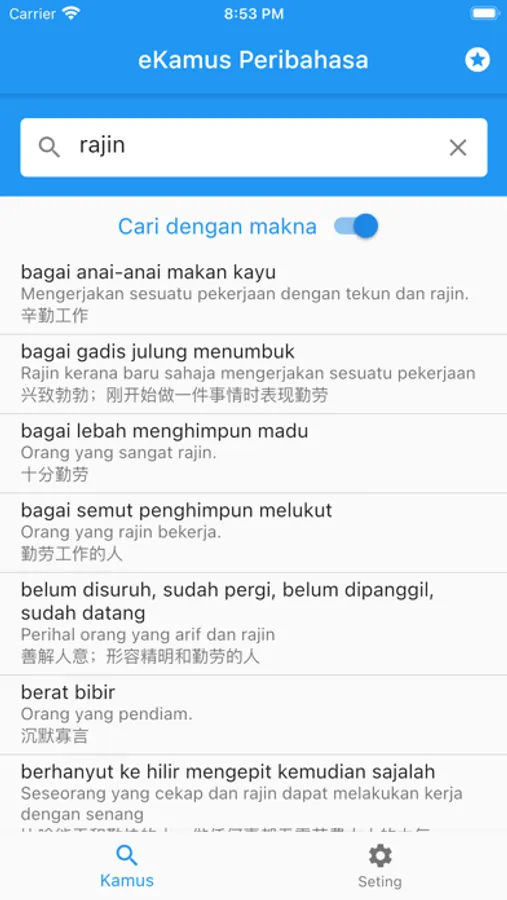 • Chinese and Malay BILINGUAL definition (with option to hide Chinese definition)