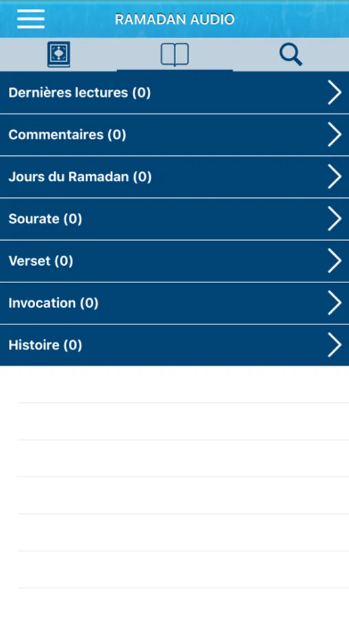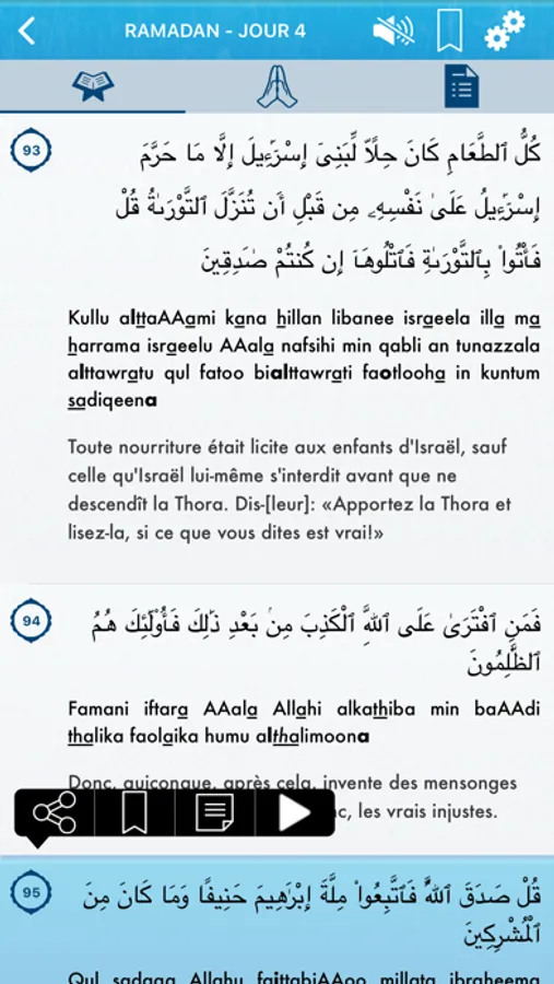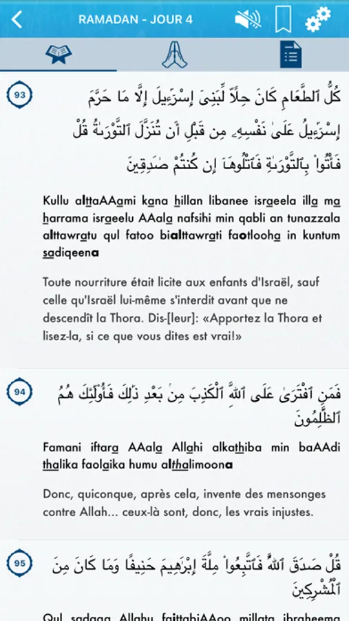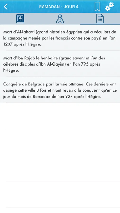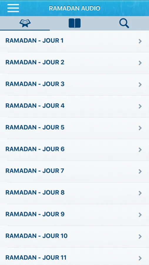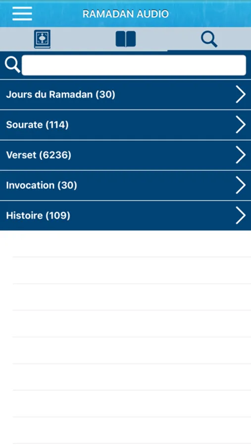 => L'application est divisée en 30 chapitres : chaque chapitre correspond à l'activité d'une journée du mois de Ramadan