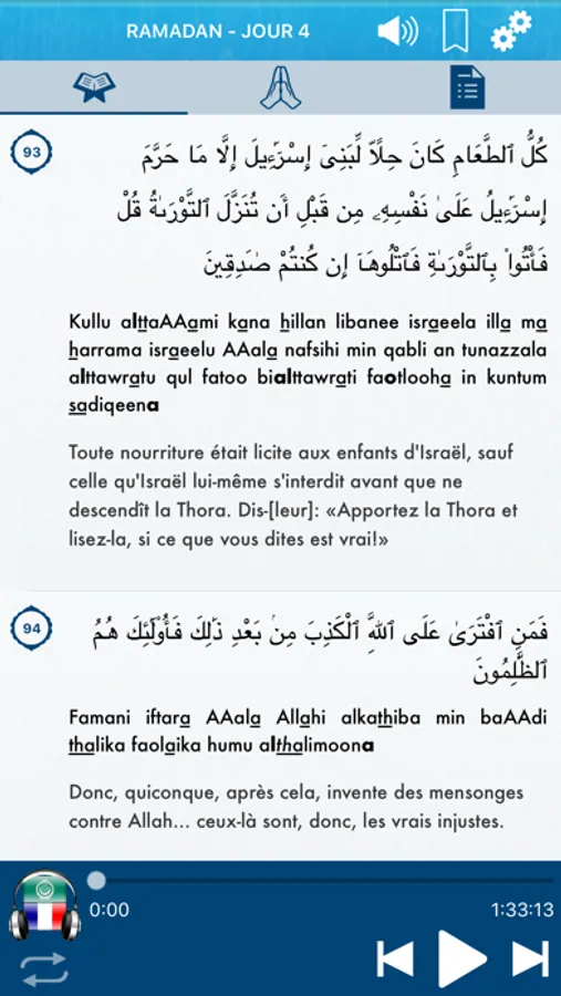 => Le Saint Coran répartie en 30 parties (Juz) au format Audio et Texte en Français, en Arabe et en Translittération (Transcription) Phonétique