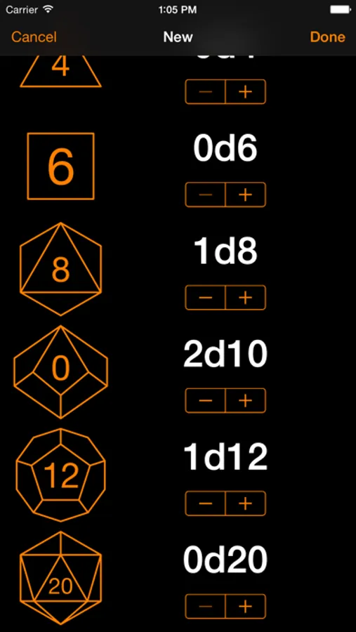 Polyhedra allows you to roll and re-roll individual dice or cups of several dice. It includes the full polyhedral dice set - d2, d3, d4, d6, d8, d10, d12, d20 and d100. Please get in touch if you'd like to see any other types.