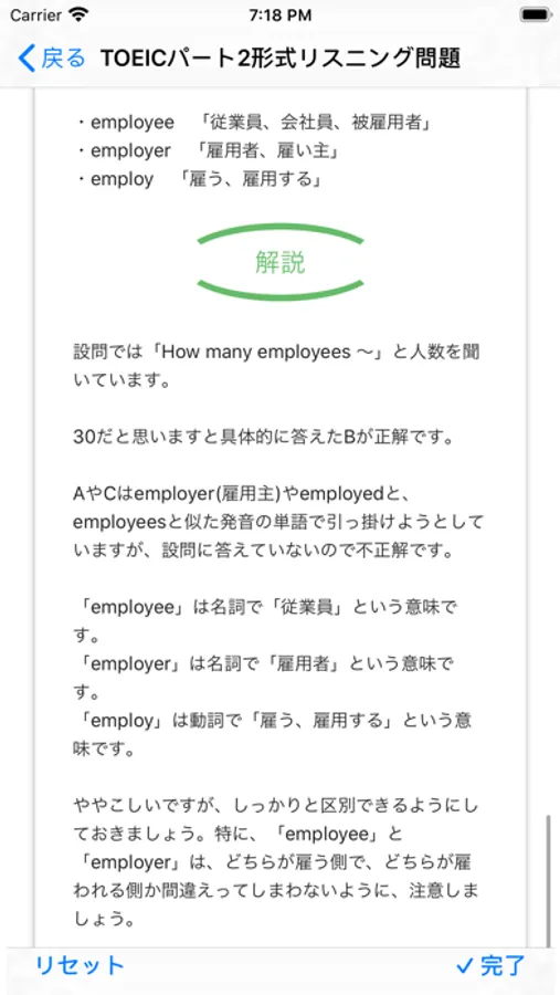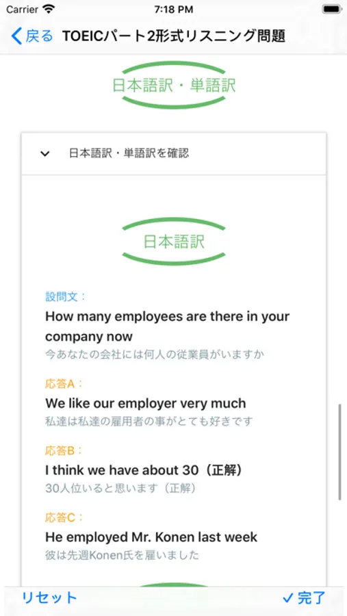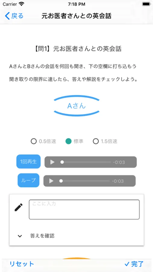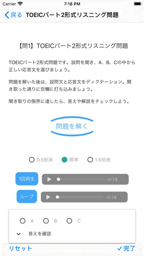 ※音声のループ再生機能、問題文スクリプト、単語訳、解説あり。
