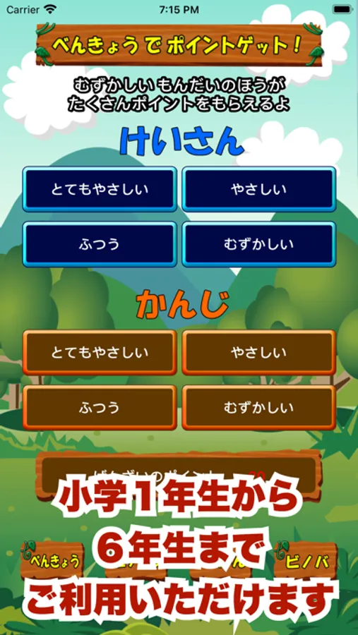計算と漢字をそれぞれ、「とてもやさしい(1年生)」、「やさしい(2年生)」、「ふつう(3・4年生)」、「むずかしい(5・6年生)」の3つに分類しているので、お子様の学年に応じて使い分けられます。難易度に応じて、獲得できるポイントに差をつけることで、お子様がより難易度の高い問題に挑戦したくなるようにしています。(1年生,2年生,3年生,4年生,5年生,6年生)