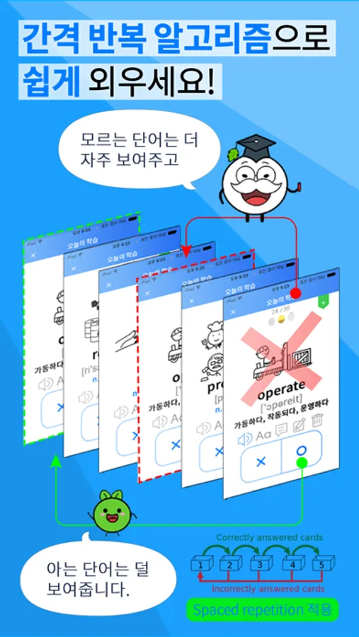 모르는 것은 자주, 아는 것은 덜 보여주는 간격 반복 시스템과 한번 외운 단어는 절대 잊지 않도록 도와주는 복습 시스템이 적용되어 있습니다.