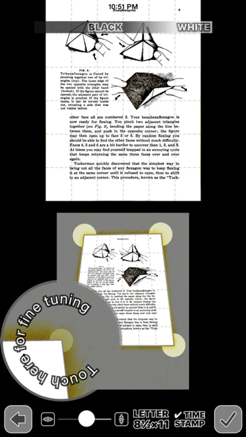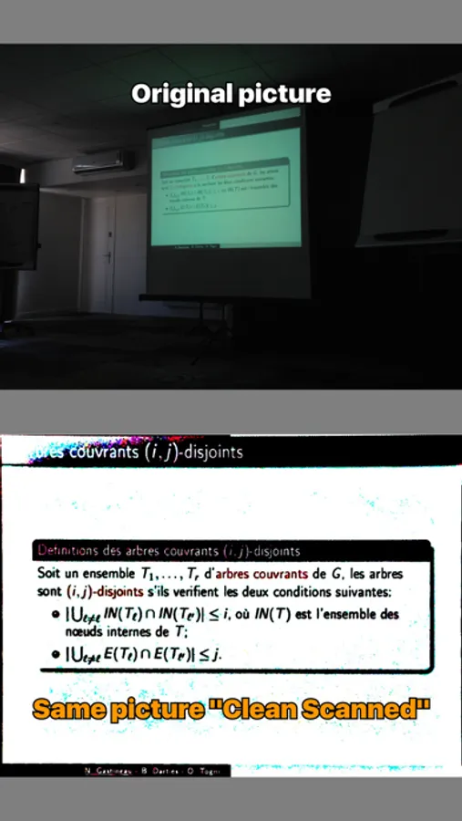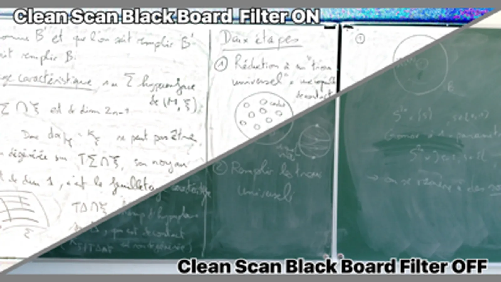 Our all-new magic filter gets rid of any background and shadows over the document, to produce a clear white background with crisp and contrasted characters and an unmatched readability and printability. Our filter is particularly efficient in difficult light conditions, and is specifically optimized for shooting white and black boards.