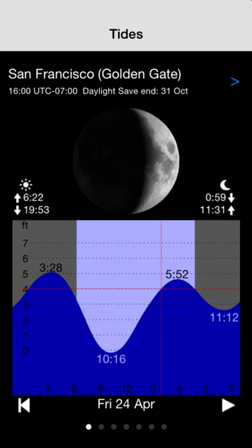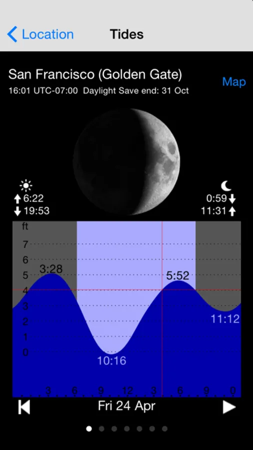Swipe left/right to see the tide chart of the next day or play an animation of moon phase and tide changes to get a quick overview.