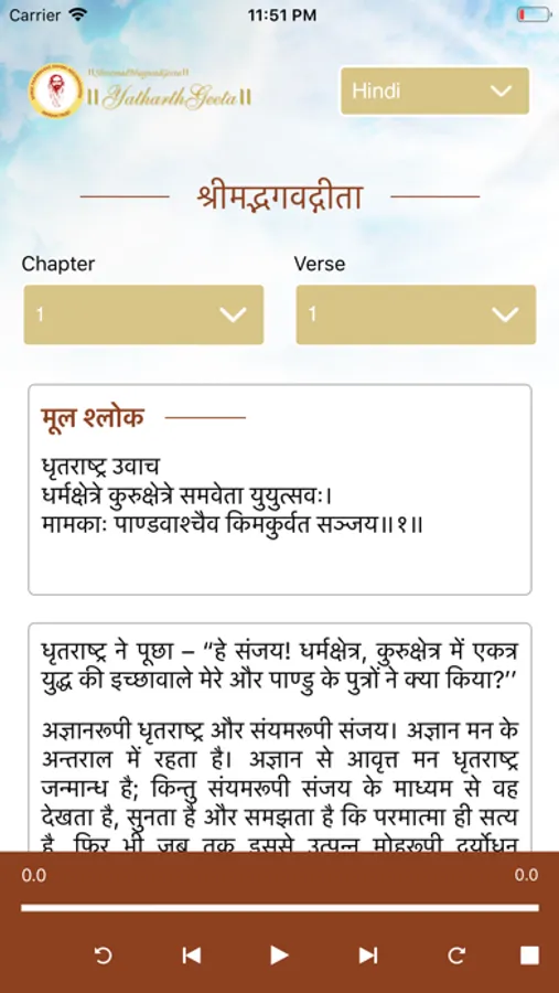 3. Audio Playback Options: Application contains Audio playback - ‘Auto Playback Shloaks’ and ‘Auto Playback Shloka Meanings’. As the user select the language, Audio of each chapter will be downloaded automatically. Listeners can then listen to 'Shlokas' along with 'it's Meaning'. Upon completion of the Shlokas/Meaning playback control automatically navigates to next shloka/meaning.