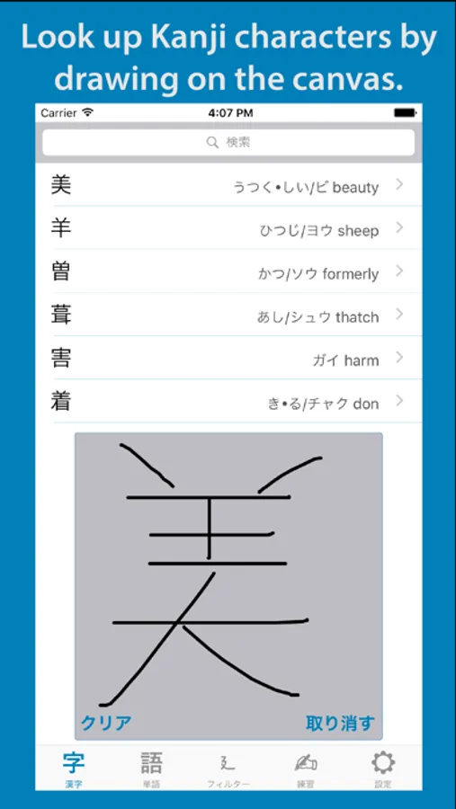 KanjiLookup Pro is a Kanji reference that focusses on - and attempts to excel at - one thing: Finding the meaning of an unknown Kanji character as quickly and easily as possible, in the only way that really makes sense on a touch-enable device: by drawing it on your screen.