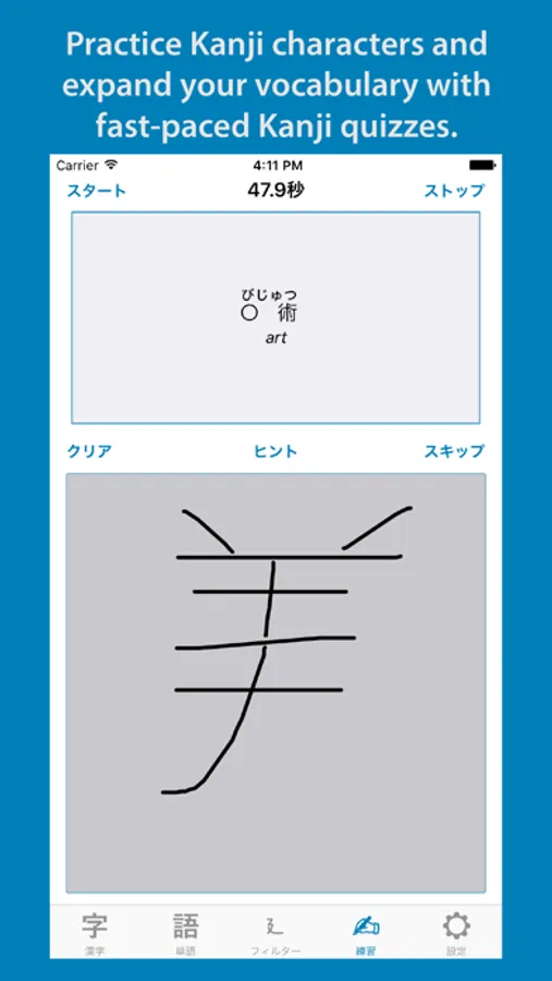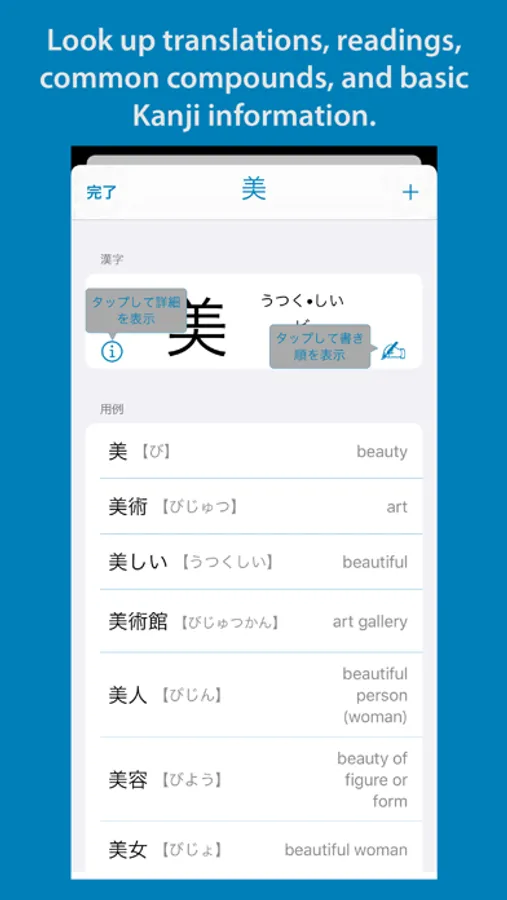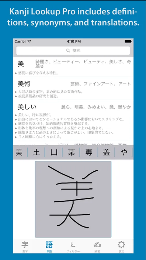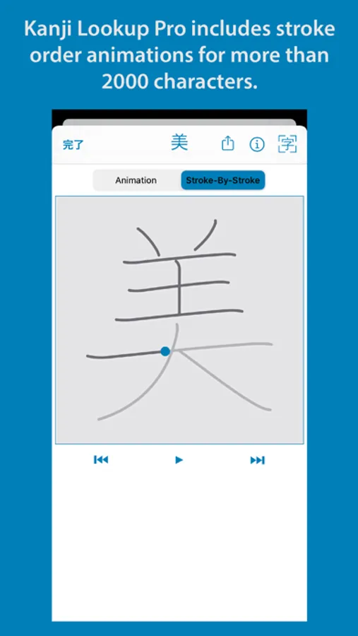 KanjiLookup Pro does not clutter your results with obscure readings only found in the name of that one mountain village or cross-references to paper dictionaries you most likely don't own anyway. Instead, it simply shows you what you are looking for: The character's pronunciation and definition. In addition, a searchable list of the most relevant words containing the Kanji character is only a tap away - along with beautifully animated stroke-order diagrams, definitions, synonyms, and much more. KanjiLookup Pro even allows you to export stroke order diagrams so that you can perfect your penmanship, making Kanji Lookup the ideal study companion.
