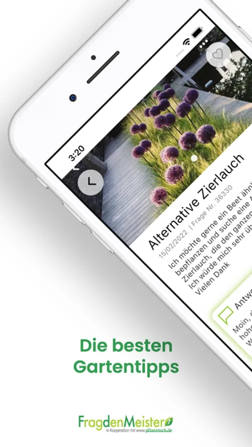 Die Frag den Meister App ermöglicht es dir direkt aus dem Garten heraus schnell und einfach Bilder und Fragen an unseren Gärtnermeister Meyer zu senden.