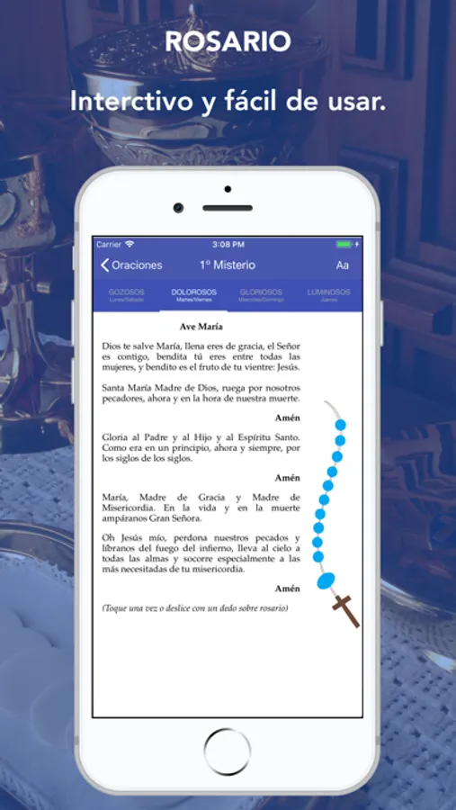 - Rosario interactivo que muestra las cuentas y las oraciones de cada misterio.