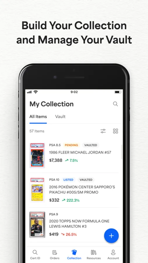 Verify and track your PSA submissions. List your Vaulted collectibles for sale instantly. Do it all within the PSA app. For certification verification, simply scan the barcode or key in the certification number to reveal grade, population, population higher, and more. To track your submissions, just log in to see when they arrived, what stage they're currently in and whether or not it has shipped with tracking. Vault your order to sell instantly on the Goldin Marketplace or Weekly Auction. Your collectibles are 100% insured and securely stored in our Vault.