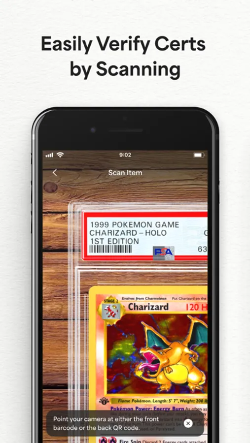 Instantly verify PSA authentication and card data with label barcode or QR code scanning.