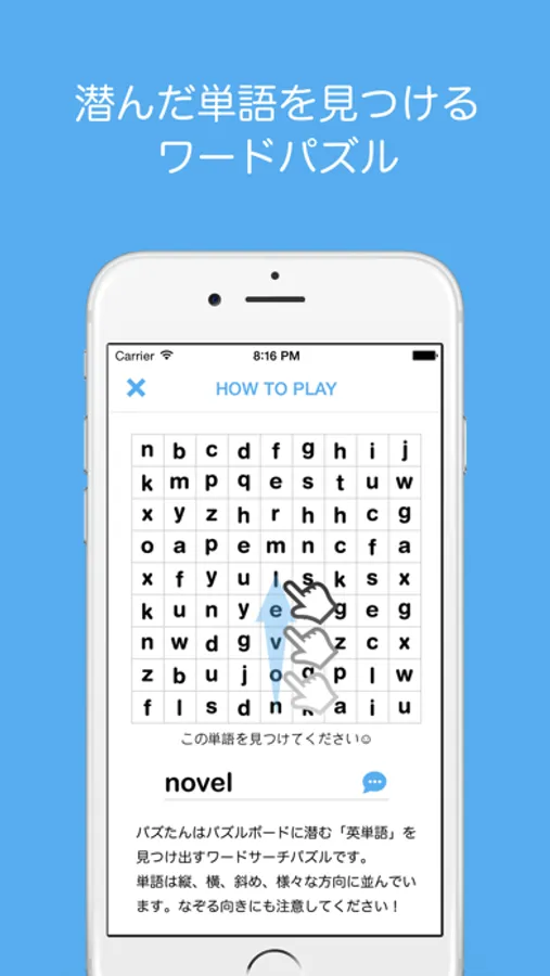 パズたんは、アルファベットが並んだパズルボードからキーワードを見つけるワードサーチパズルです。