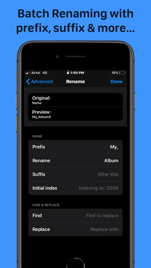● BATCH RENAMER - Batch renaming is easy and fun. Make it truly yours with added custom suffix and prefix of your choice. Find any word in the Image name and replace it with your favorite word to make it memorable.