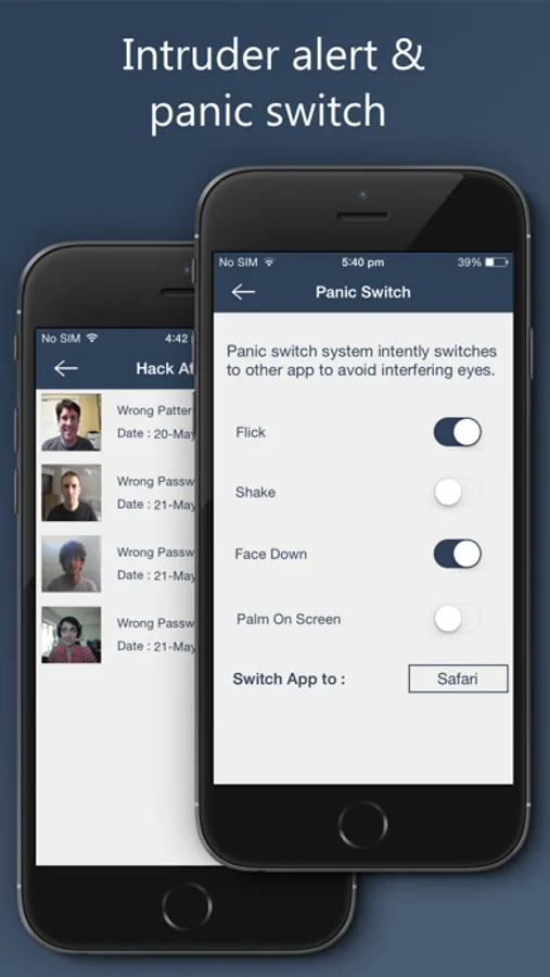Face down, flick or shake to switch to another application immediately – prevents shoulder surfing.