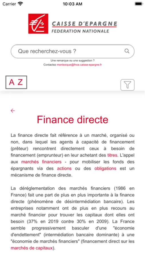 Après une identification unique communiquée par votre Caisse d’Epargne régionale, utilisez le moteur de recherche de l’outil puis cliquez pour découvrir des définitions courtes et illustrées ! Au-delà d’une définition texte, l’outil vous permet d’accéder, en complément, à un lien vers un site externe, une vidéo, une illustration…