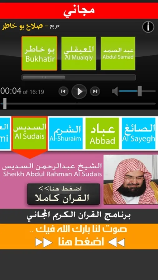 القران الكريم المجاني " يحتوي على مجموعة من اشهر القراء و بعض سور القران الكريم باصواتهم و لكن لا يحتوي على كامل القران الكريم" - له مميزات كبيرة