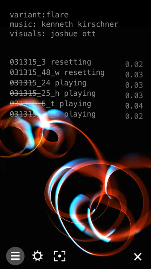 You can view the indeterminate audio engine by tapping the dot in the lower right. The display shows the different elements of the musical composition as they are loaded by the engine through a combination of chance and user input. The center button opens a menu of settings for the app, and the button to the right allows you to take screenshots of the visuals, automatically saving them to your photo library.