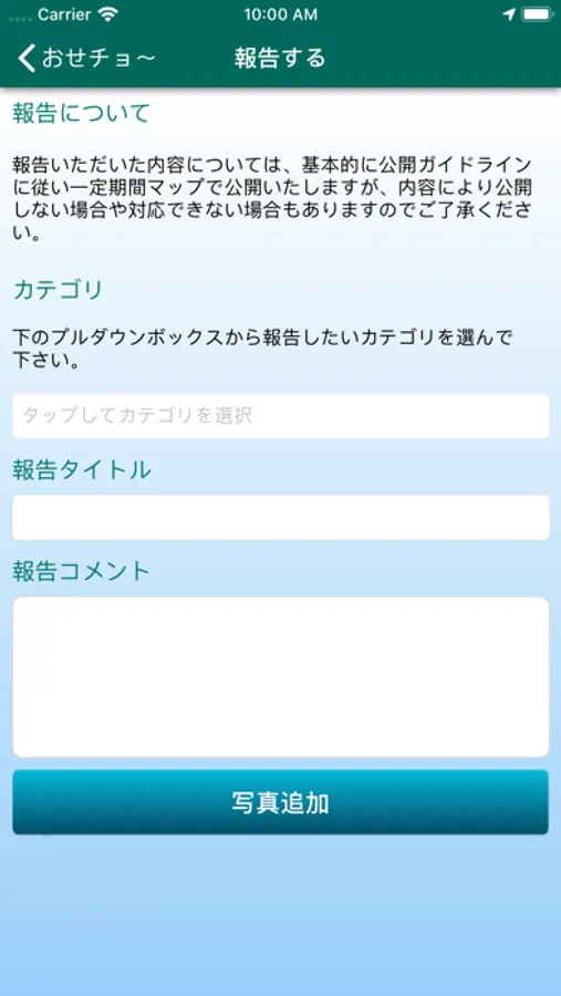 アプリからカテゴリーを選択して写真と位置情報で、直接担当課に報告することができます。