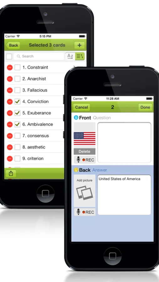 - Make your own customize flashcard decks. (Supports text, photo and audio both 2 sides of card).