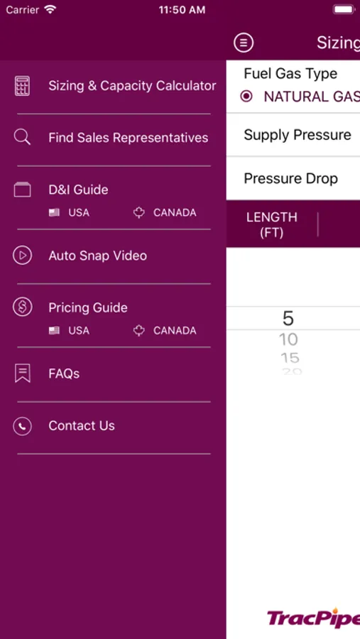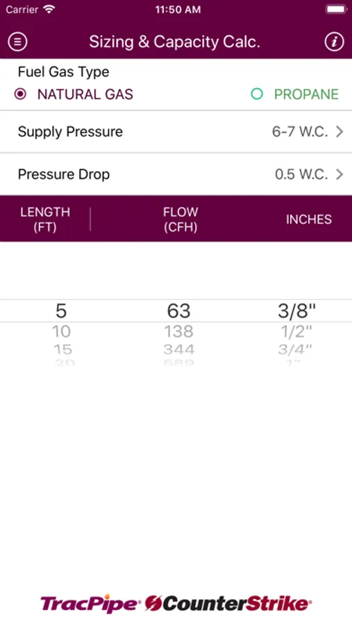 This App allows the user to size the TracPipe® Flexible Gas Piping products, to either the Longest Run or Branch length method of gas pipe sizing. Whether the installation is in TracPipe, PS-II or TracPipe CounterStrike® the App displays the appropriate size of piping for a given capacity depending on the type of gas, supply pressure and allowable pressure drop selected by the user. By selecting the design parameters using easy drop down menus the user then chooses the length of pipe and tubing size, on the easy to read calculator wheel, to find the capacity capable of being delivered by any of the seven sizes offered by TracPipe.