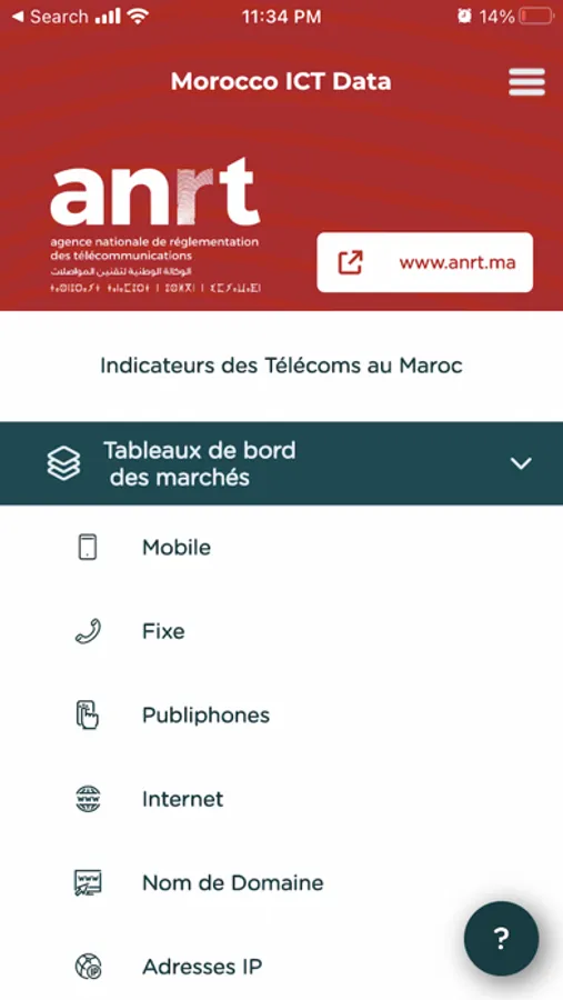 Designed by the Moroccan National Telecommunication Regulatory Agency (ANRT), Morocco ICT Data allows access to many indicators on information and communication technologies in Morocco. Indicators cover many segments such as mobile and fixed telephony, Internet, payphones, domain names and IP addresses; and give an accurate idea about subscribers’ accounts, penetration rate, markets shares, traffic, revenues, usages and telecom infrastructures in Morocco. Some indicators show the evolution of the sector since 2004.