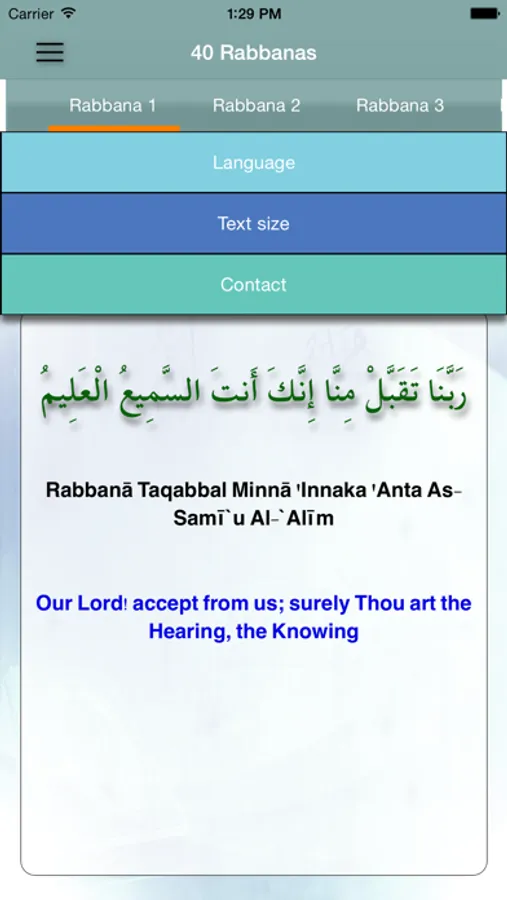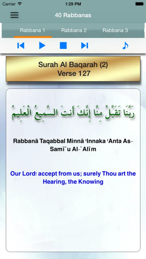 This application is a collection of 40 Douas (invocations) of the Qur'an that begin with the word "rabbana" (Our Lord).