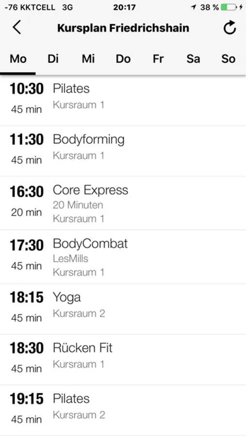 Direkter und aktueller Zugriff auf den Gruppentrainingsplan: Für jeden Kurs können Sie Details wie Zeit, Kursbeschreibung und leitender Trainer einsehen.