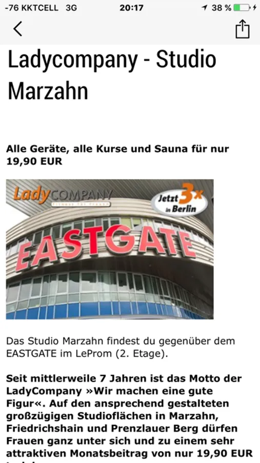 Informationen wie Öffnungszeiten, Kontaktdaten, Studiofotos und Trainingstipps sind griffbereit und können sofort per E-Mail zu Freunden geschickt werden.