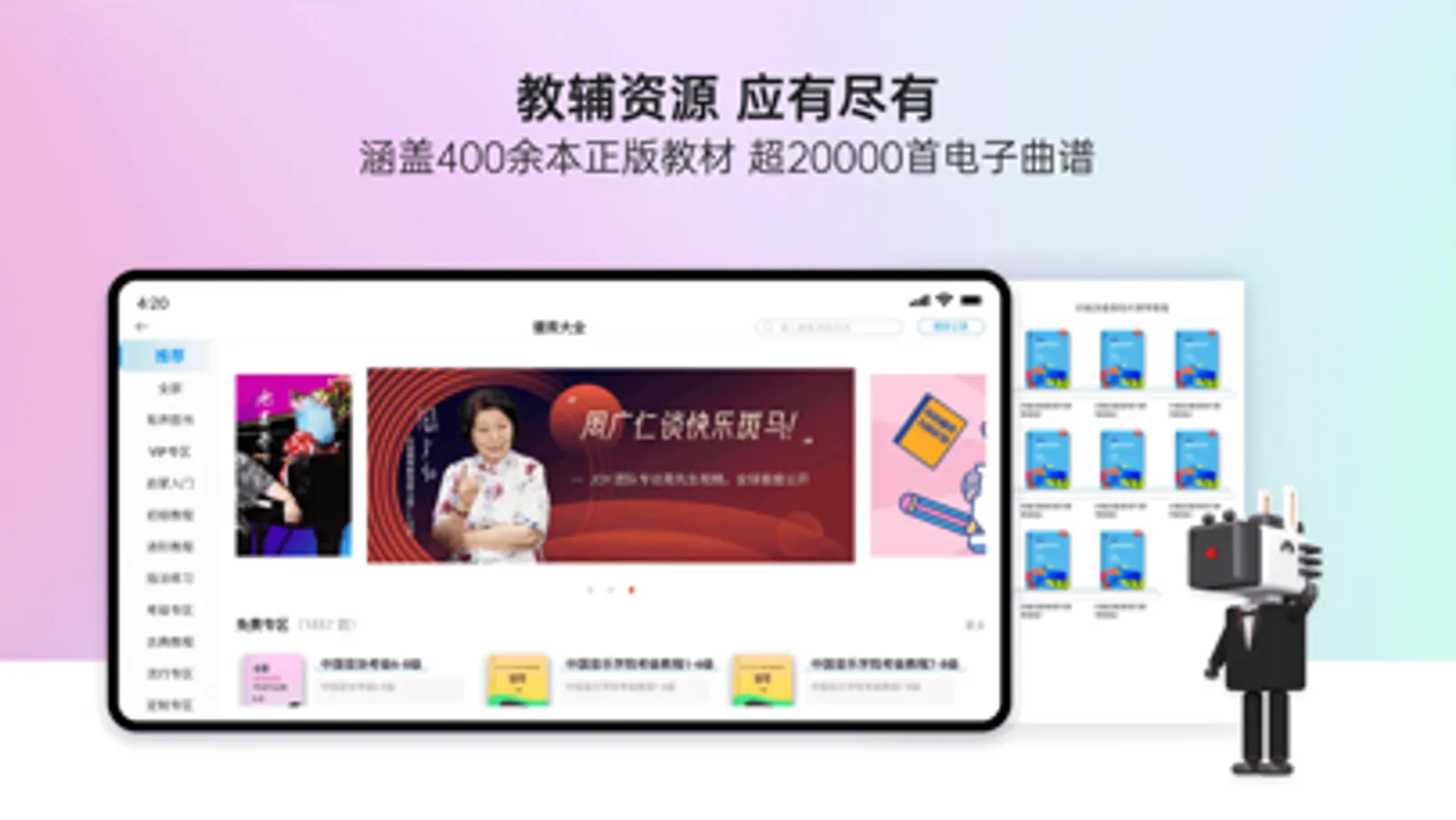 【有声图书】20000多首正版教材曲库,方便查找曲目;1:1呈现纸质教材原版谱面,可听、可看、可学、可练、可演,让练琴简单有效率。