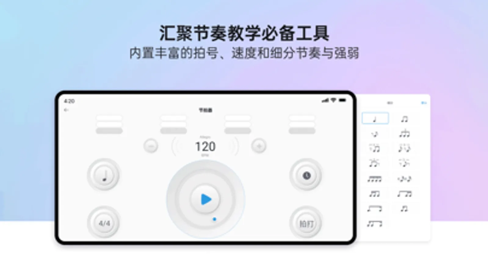 【多功能节拍器】颠覆了传统节拍器的局限性,只需简单的屏幕操作就可以实现对速度和节拍的调整,教师可以根据课程需要设置任意节奏,学生也可直观看到节拍的组成与重音的位置。