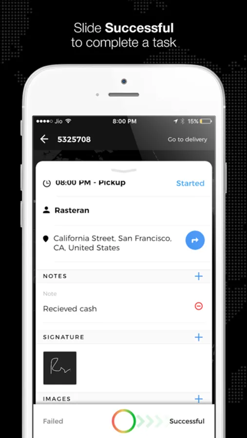 • Get customer signature, add notes and add images as a proof of delivery