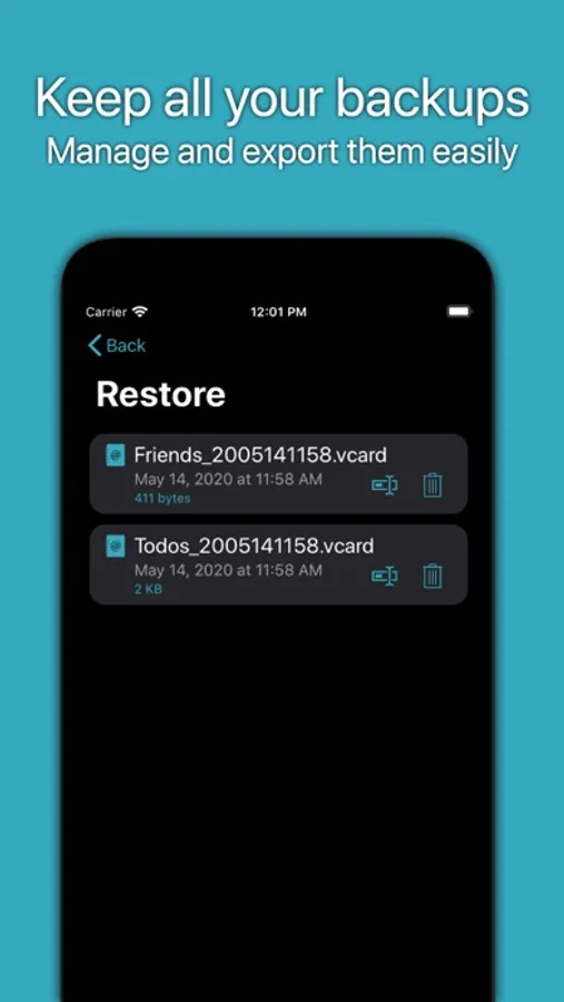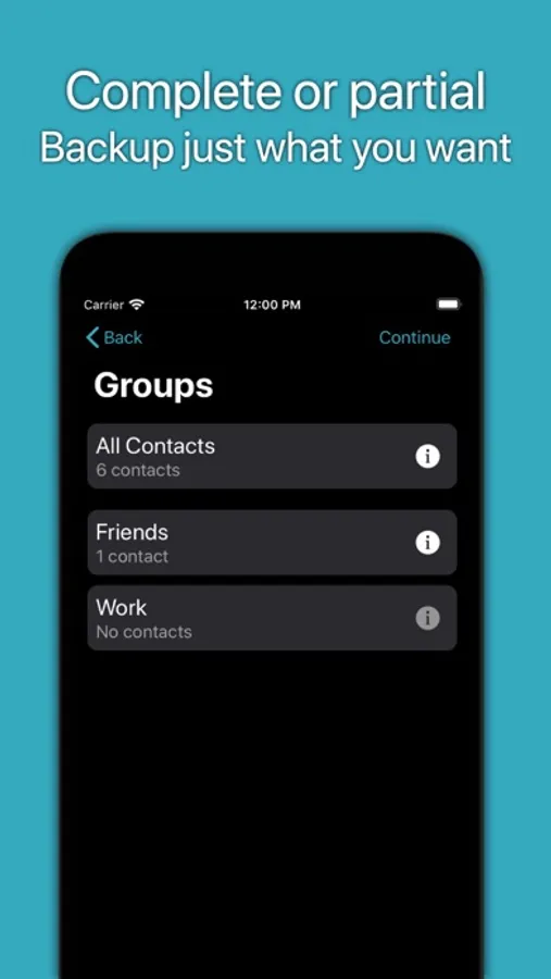 No matter if you change your phone or just want to have a backup of your address book on your device, ContactSecure allows you to save your backup, mail it, send it using iMessage or any other application that supports file sharing.