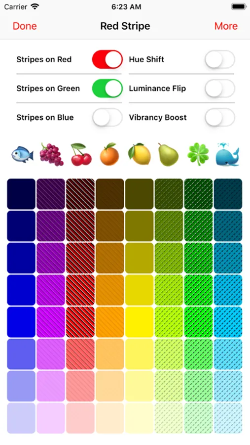 Stripes are good to distinguish other colors too. Stripes are more or less pronounced depending on whether the tint is closer to red, green, or blue. Stripes can be shown or hidden for any color.