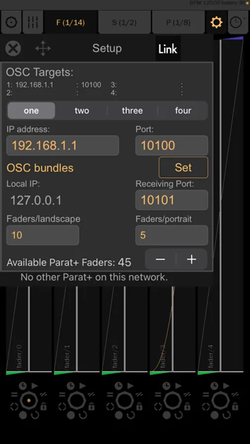 The fader-style controller modules at the core of Parat+ can control parameters and functions of any MIDI and/or OSC enabled software and hardware. Multiple OSC targets can be defined to optimise user flexibility.